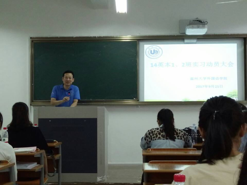 2017年9月25日下午1:30, 太阳成集团tyc7111cc2014级英本师范1、2班实习动员大会暨专题讲座在外语楼210教师进行。此次与会人员有太阳成集团tyc7111cc院长毛继光、副院长李新德、教学科副科长邵康燕老师、实习指导教师薛丽芳老师、瓯海区教师发展中心薛丽娜老师和14英本师范1、2班全体同学。