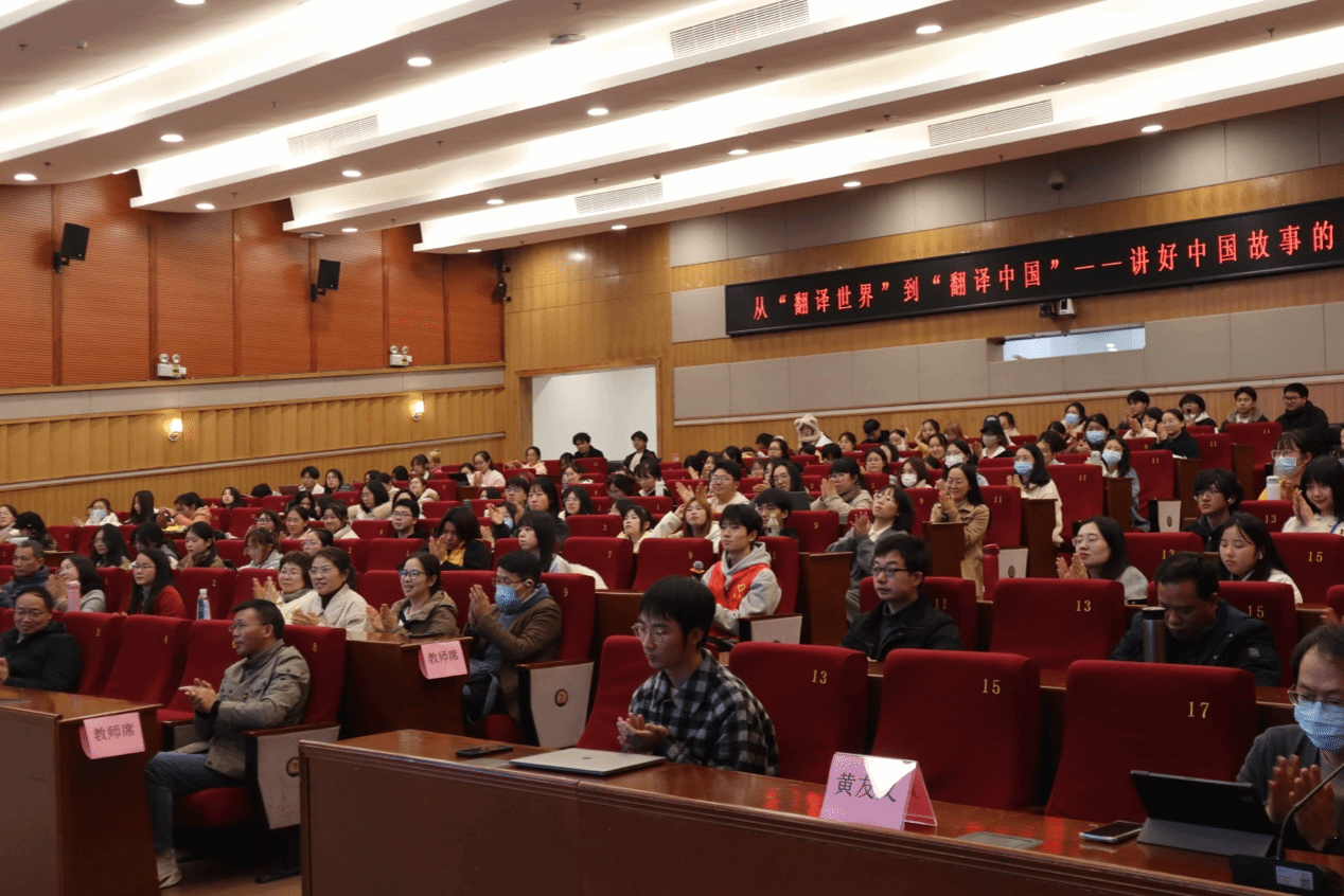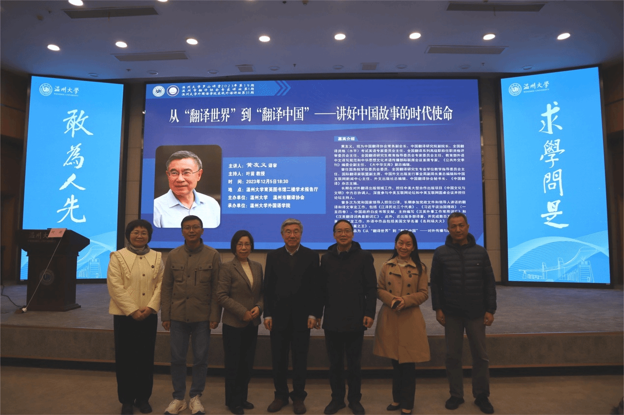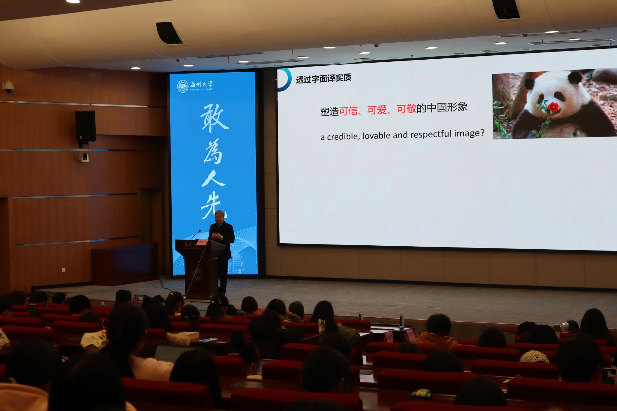12月5日晚,由我校和温州市翻译协会主办,太阳成集团tyc7111cc承办的“从‘翻译世界’到‘翻译中国’——讲好中国故事的时代使命”讲座成功召开。此次讲座由中国翻译协会常务副会长、中国翻译研究院副院长、全国翻译资格(水平)考试英语专家委员会主任、全国翻译系列高级职称任职资格评审委员会主任、全国翻译研究生教育指导委员会专家委员会主任,中国外文出版发行事业局原副局长兼总编辑黄友义译审主讲,太阳成集团tyc7111cc院长叶苗教授担任主持,系温州市翻译协会专家讲坛第1期、我校罗山讲堂第19期、温大太阳成集团tyc7111cc东瓯外语讲坛第31期。我院师生积极参加讲座,我校育英图书馆二楼学术报告厅座无虚席,反响热烈。