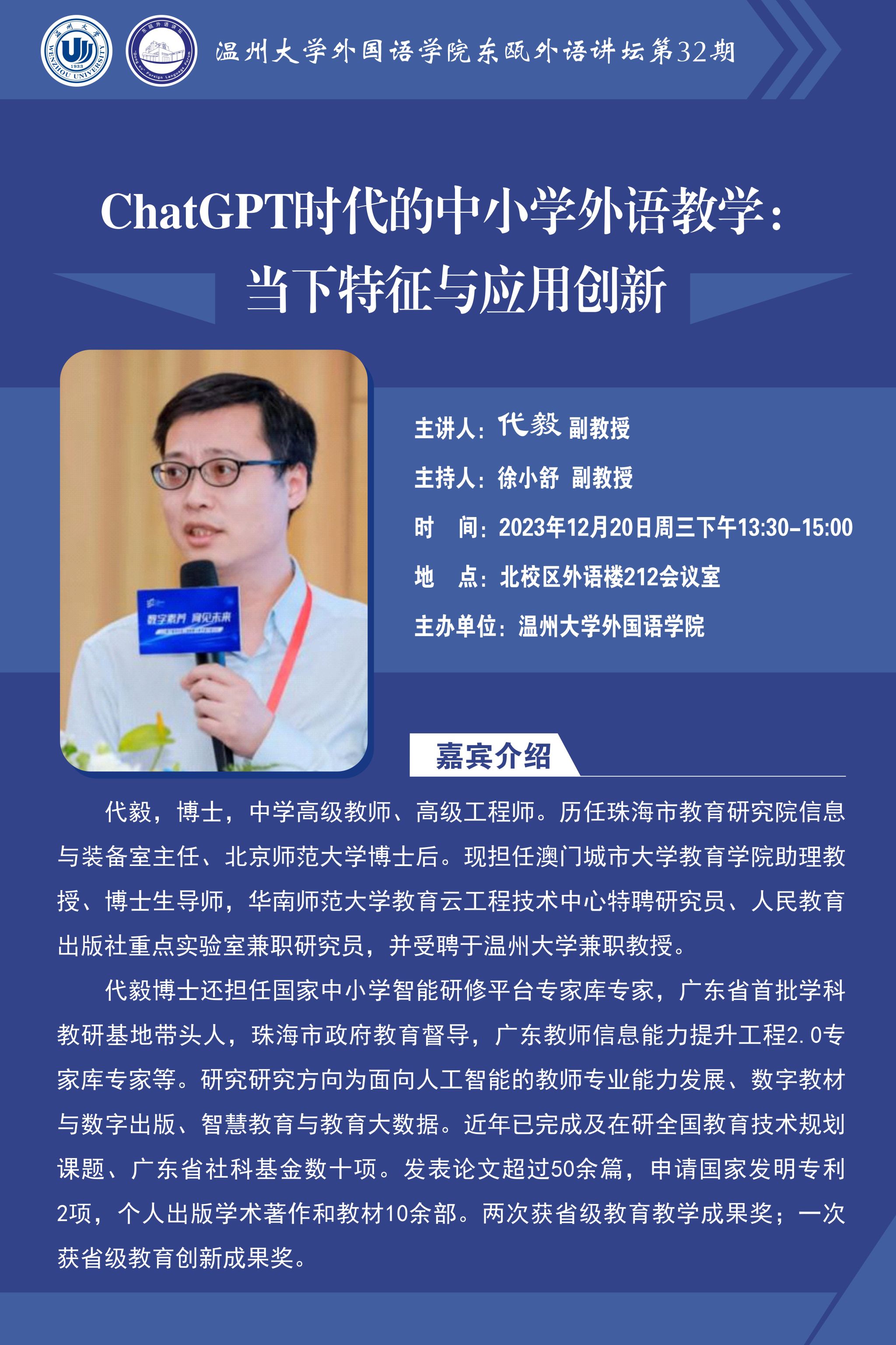 东瓯外语讲坛第32期预告:ChatGPT时代的中小学外语教学:当下特征与应用创新