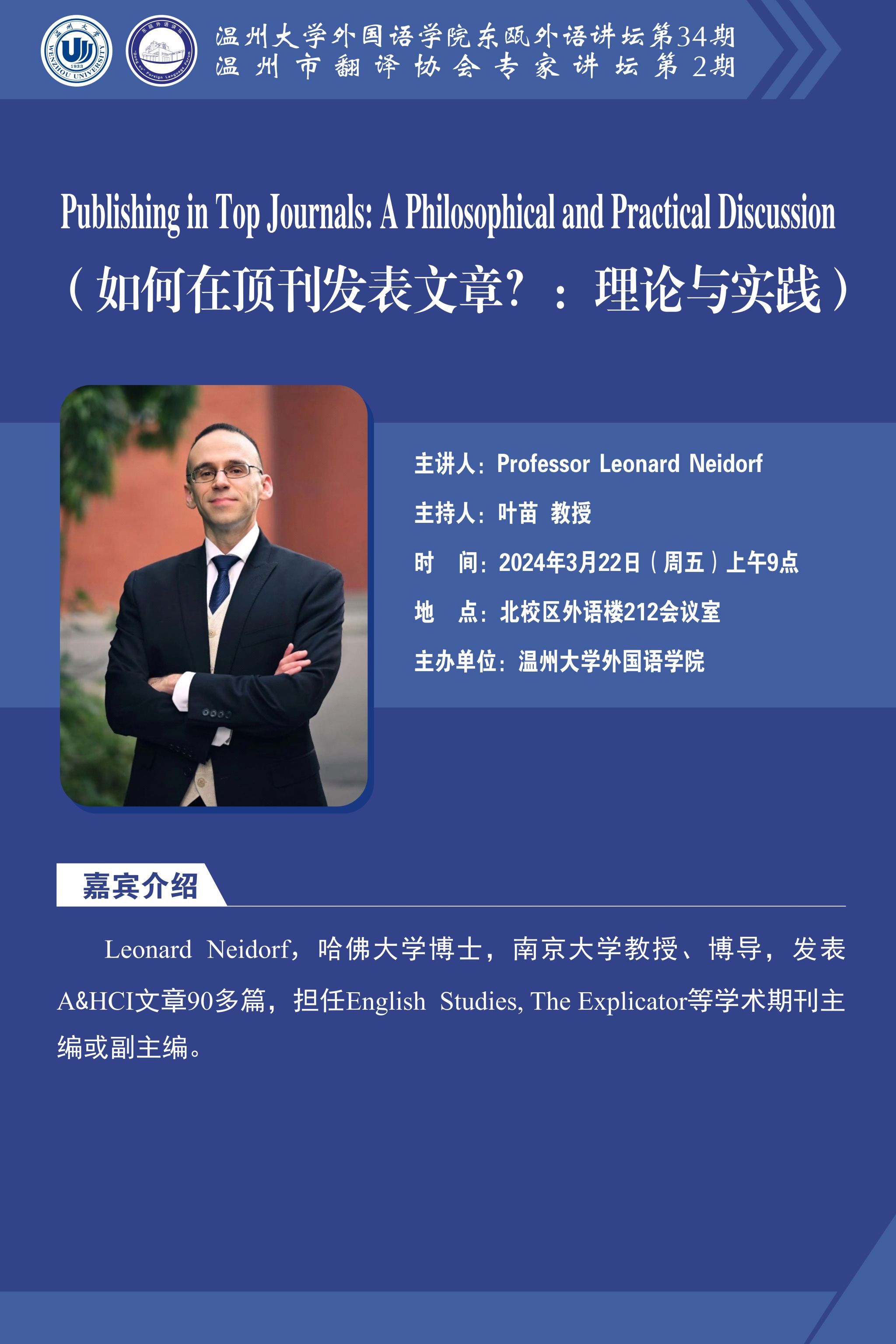 东瓯外语讲坛第34期预告:Publishing in Top Journals: A Philosophical and Practical Discussion(如何在顶刊发表文章?理论与实践)