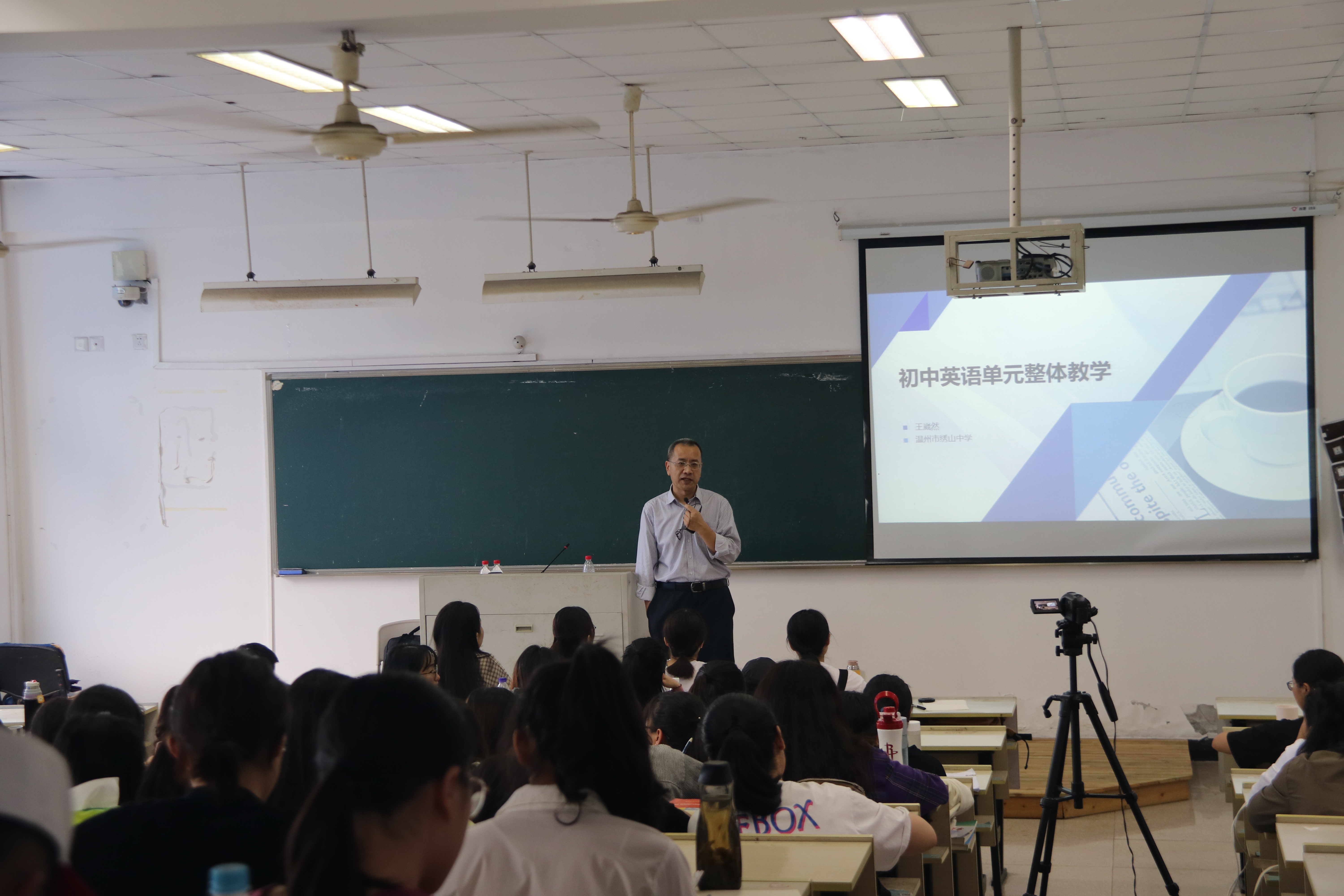 2019年10月9日下午1:30,温州市绣山中学浙江省特级教师王崴然在北校区1号楼301教室为太阳成集团tyc7111cc学生开展“初中英语单元整体教学的对策”讲座。讲座由学科教学(英语)硕士点负责人李宋昊老师主持,薛丽芳老师、19级研究生和17级英本师范学生认真聆听了此次讲座。