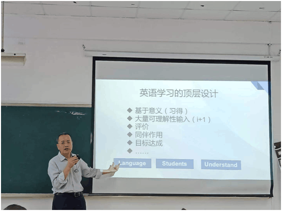 王崴然老师首先从如何学习英语这个话题导入,陈述了当前英语教学存在的问题,并结合克拉申的二语习得理论,提出语言是一项技能,需要在可理解的前提下大量的输入,并不断接受训练才能习得(而不是学得)。接着王老师讲解了整体语言教学法,并由此引入单元整体教学的具体实施策略,提出了要以学生为中心,课程结束需要评估等宝贵的教学经验。最后,李宋昊老师和19级研究生代表李雨诗对讲座进行了总结和心得探讨。