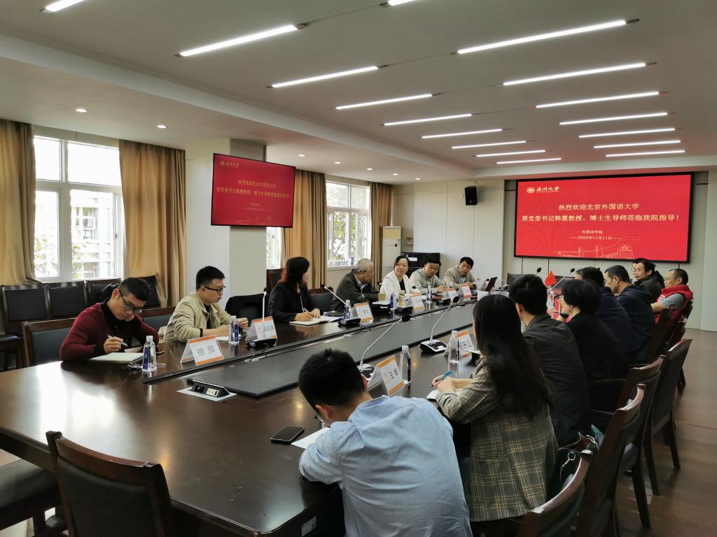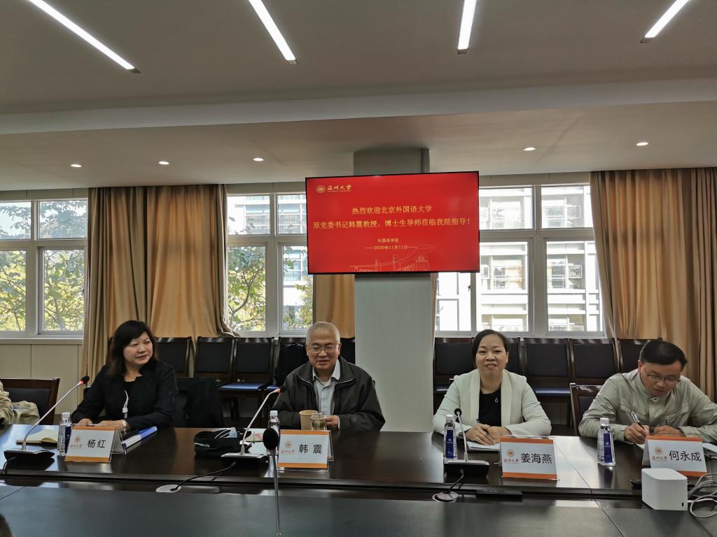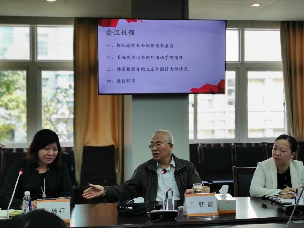 11月11日上午,北京外国语大学原党委书记、博士生导师韩震教授莅临我院指导交流,学院班子成员和部分教师代表参加了座谈会。座谈会由杨红副院长主持。