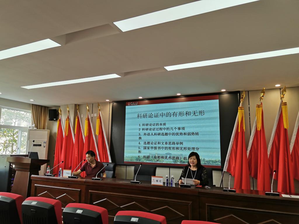 讲座伊始,杨红副院长首先对于善志教授的到来表示热烈欢迎并对于教授做了简要介绍。于教授围绕“科研论证中的有形和无形”这一主题,从科研论证的本质、科研论证中的几个事项、外语人科研选题中的优势和弱势转换、选题论证和文章思路举例、国家课题申报书中的有形和无形处理分析、科研(有形和无形思路)的功效等六个方面对如何做科研、怎样做好科研进行了详细的讲解,并结合自己在撰写,评阅国家课题申报书的经验对我院教师进行了国家课题申报书撰写的指导。讲座的提问环节,老师们和研究生代表就学术研究中的困惑向于教授认真请教,于教授和我院师生进行了深度交流,对师生们的提问给予了耐心解答。