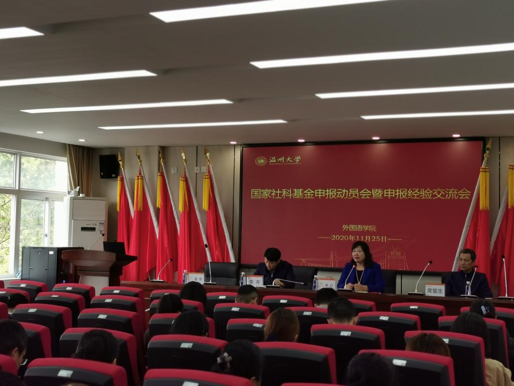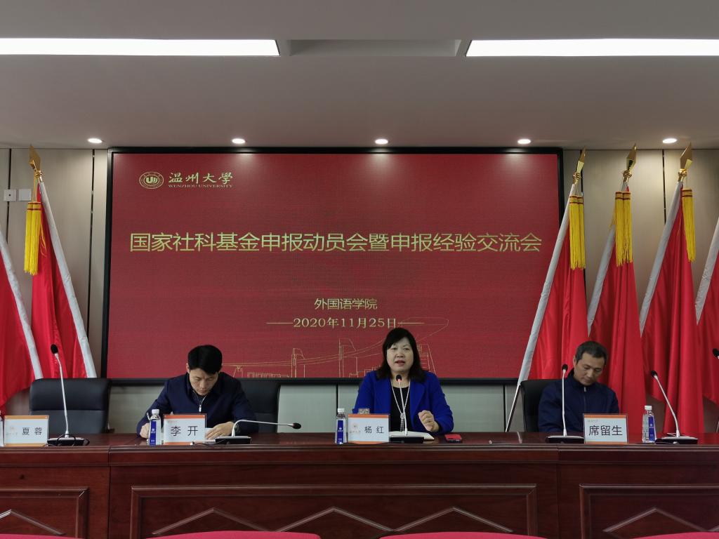 11月25日,太阳成集团tyc7111cc国家社科基金申报动员会暨申报经验交流会在外语楼214学术报告厅举行,会议由杨红副院长主持,全体教师出席了本次会议。