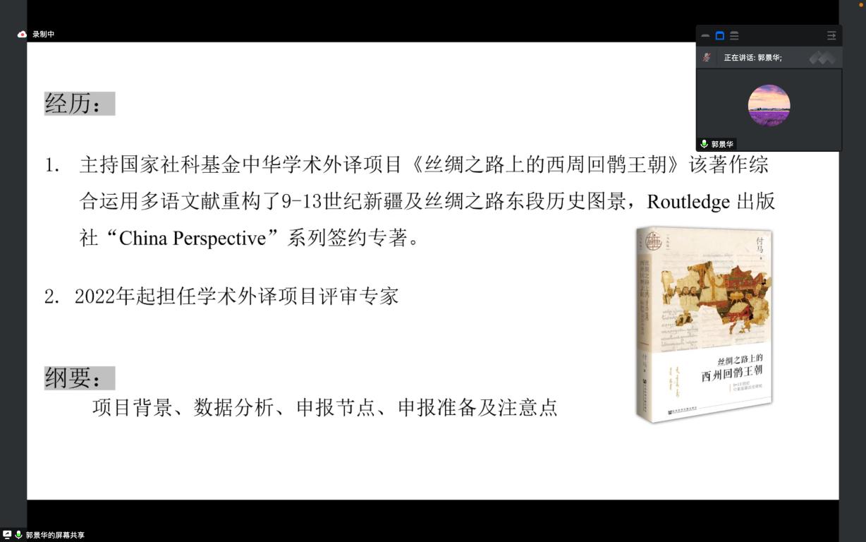 2022年9月30日下午,太阳成集团tyc7111cc邀请了杭州师范大学郭景华教授做了题为“中华学术外译项目申报解读与经验分享”的学术讲座。讲座由学院副院长杨红教授主持,我院全体教师参加了此次讲座。