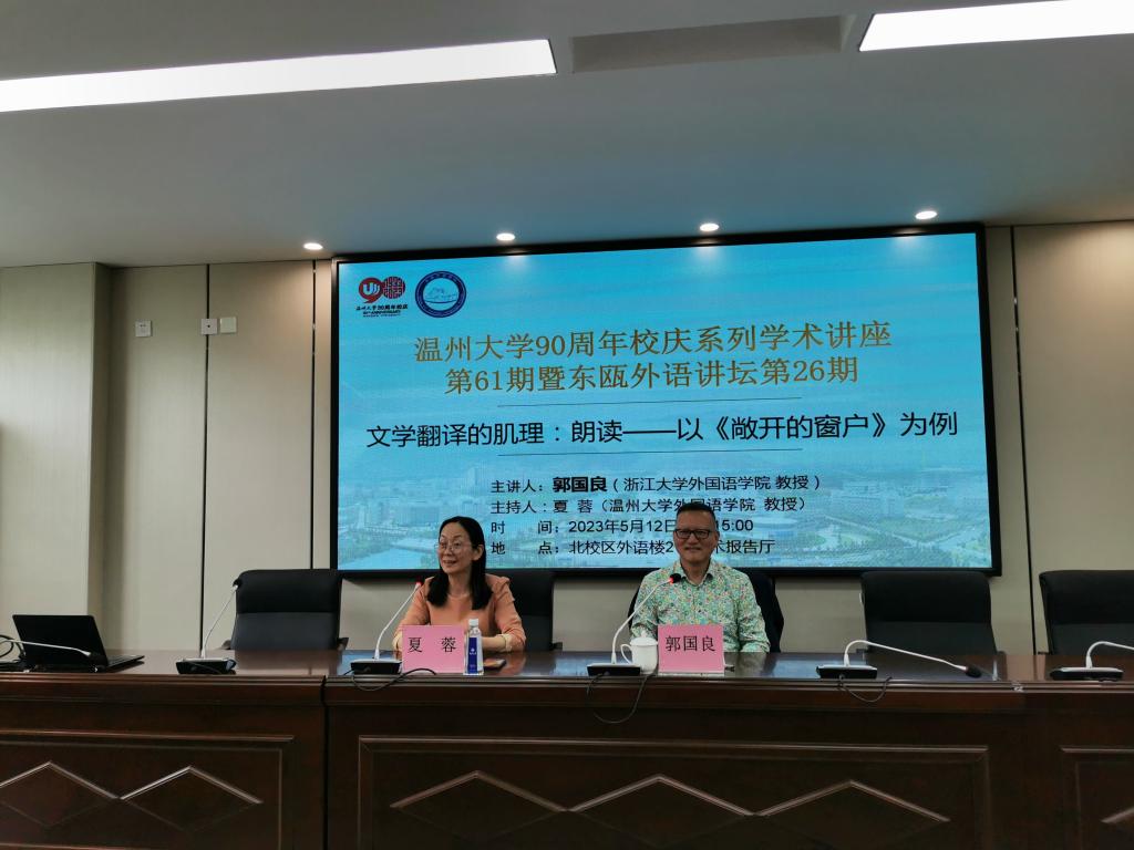 5月22日下午,太阳成集团tyc7111cc邀请了浙江大学太阳成集团tyc7111cc郭国良教授作《文学翻译的肌理:朗读——以《敞开的窗户》为例》的学术讲座。讲座由翻译系主任夏蓉教授主持,我院全体教师参加了此次讲座。