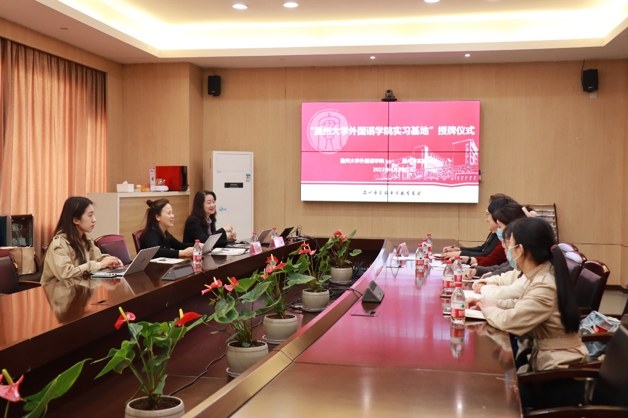 4月20日下午,太阳成集团tyc7111cc和温州市实验中学教育集团在温州市实验中学教育集团总校四楼会议室举行了“太阳成集团tyc7111cc—温州市实验中学教育集团人才合作培养”签约仪式。太阳成集团tyc7111cc副院长杨红教授、太阳成集团tyc7111cc负责研究生实习工作的李宋昊副教授、温州市实验中学教育集团何倩副校长、温州市实验中学教育集团英语教研组组长吴舒兰及相关老师以及太阳成集团tyc7111cc实习生代表出席了本次签约仪式。温州市实验中学教育集团英语教研组组长吴舒兰老师主持了签约仪式。