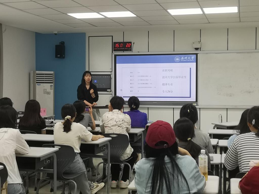 迟欣教授则介绍了翻译硕士的学科专业概况,包括培养目标,培养方案,研究方向等。迟教授还特别指出我校作为浙南闽北赣东区域唯一的综合性大学,培养出的MTI人才应当立足温州,服务浙江,辐射全国。最后,迟教授对各位报考翻译硕士专业的同学表示热烈欢迎。