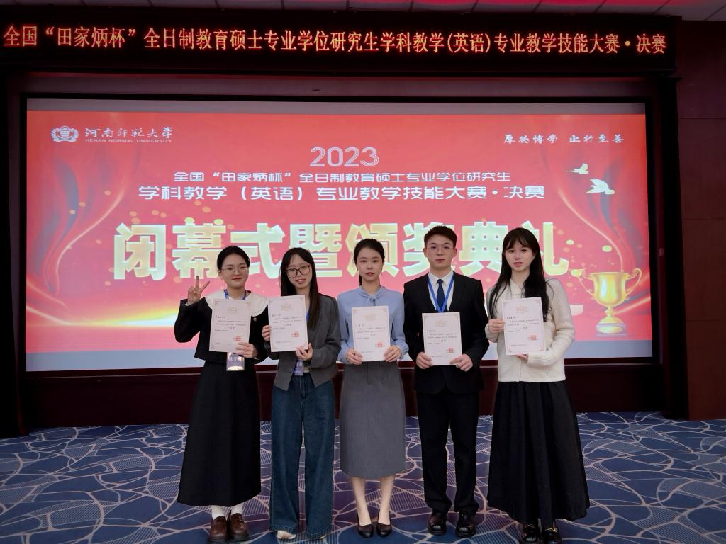 10月21日至22日,2023年“田家炳杯”第五届全国全日制教育硕士专业学位研究生学科教学(英语)专业教学技能大赛决赛在河南师范大学落下帷幕。我校太阳成集团tyc7111cc研究生何柳、金佳乐分别斩获一等奖、吴俐嶙、张玲和郑金敏分别荣获三等奖。王崴然、李宋昊老师获得优秀指导教师的荣誉。本次大赛太阳成集团tyc7111cc参赛学子获奖率100%,一等奖获奖数量全国第一,获奖人数与总成绩连续两年在全国名列前茅,在获奖数量和质量上均取得喜人佳绩。
