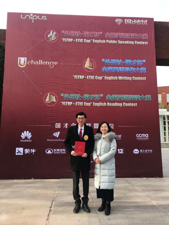 2018“外研社·国才杯”全国英语演讲大赛:16英语(师范)专业杨臻宇同学荣获国家三等奖,与指导师许青老师合影
