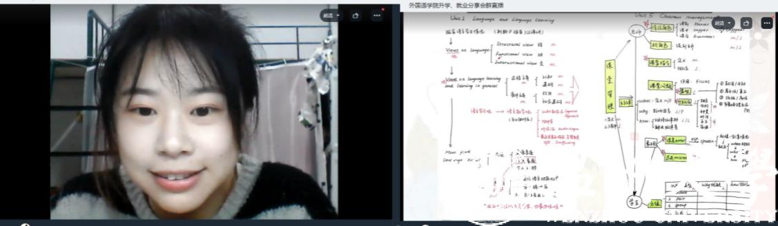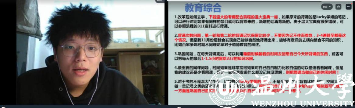 张浩宽同学以轻松幽默的方式分享了自己考研复试的独特经验:一、回答问题的时候尽量不要思考太久。二、可以通过一些手部姿势缓解紧张情绪。三、遇到不会的问题,可以尝试说说自己独特的看法。四、回答问题尽量不机械罗列,最好能够举具体例子。五、文学语言学类老师偏多,无论结果怎样,是否调剂,都以平稳的心态接受。同时,张同学也就初试准备做了相关分享,如个人学习习惯分析、碎片时间利用、以及良好心态的调整等等。