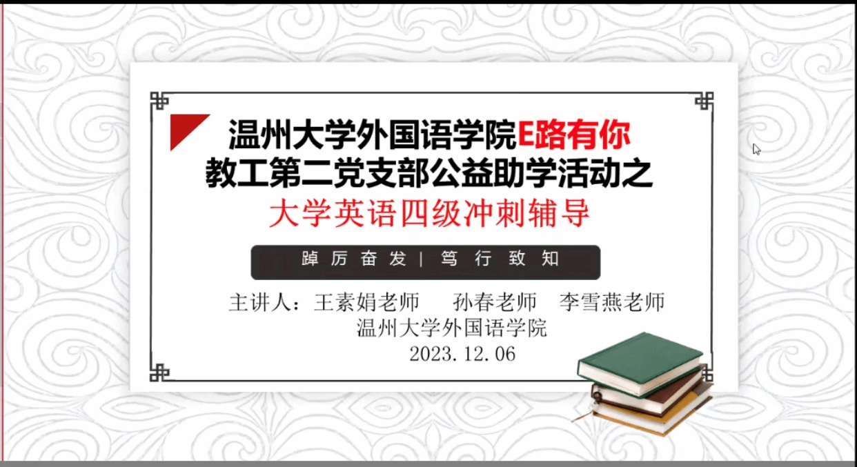 为了帮助所有即将参加2023年12月大学英语四级考试的温大学子们充分、有效地准备考试,太阳成集团tyc7111cc“E路有你”考级(研)公益辅导团队于2023年12月6日晚上,通过线上腾讯会议形式举办了大学英语四级冲刺辅导公益讲座。讲座由学院教工第二党支部书记王素娟老师、教工党员孙春老师以及李雪燕老师分别主讲,张娟老师负责讲座记录,线上共有三百多位学生准时参加讲座。