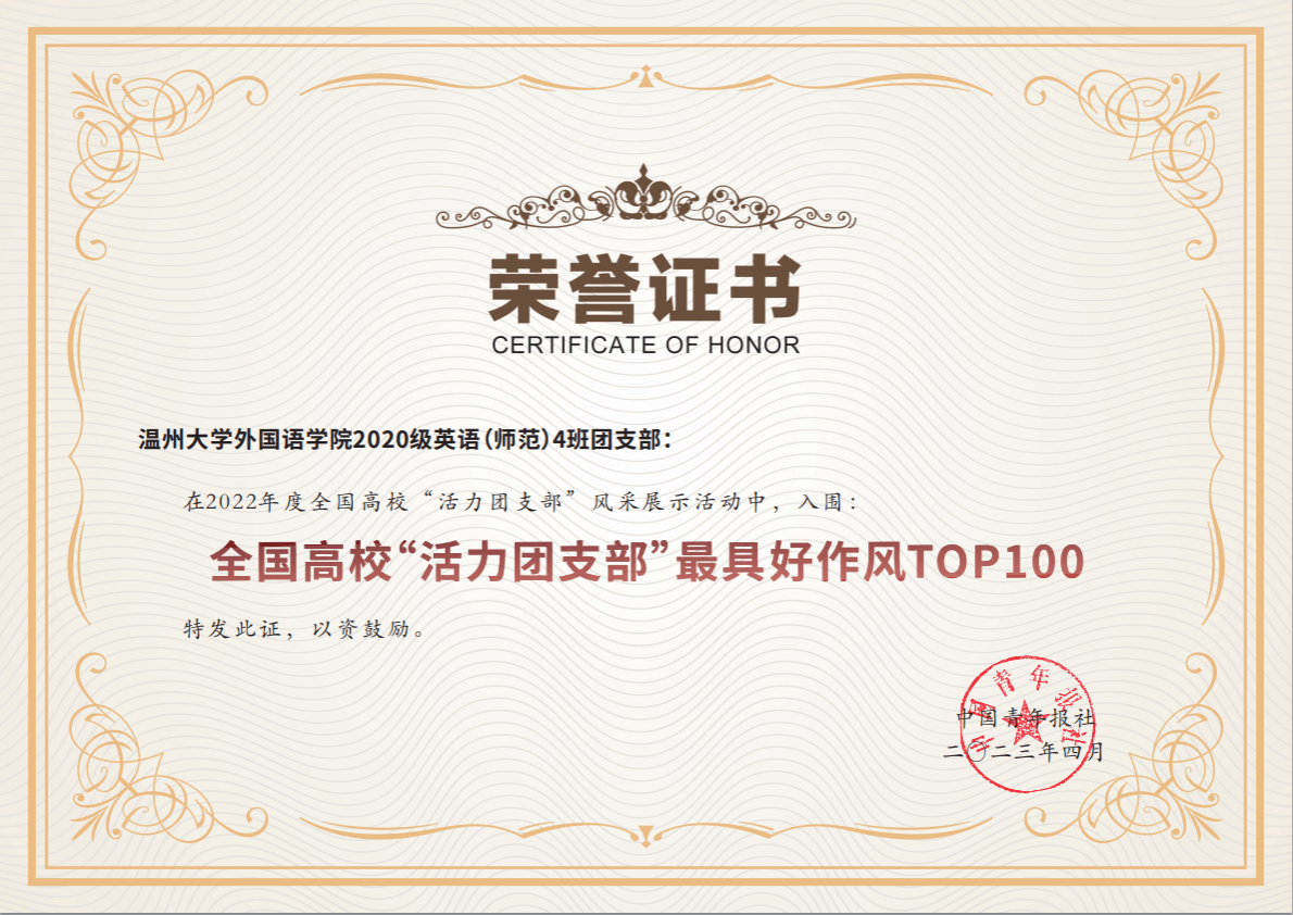 2023年4月,学院2020英语师范4班团支部入选全国高校“活力团支部”最具好作风TOP100