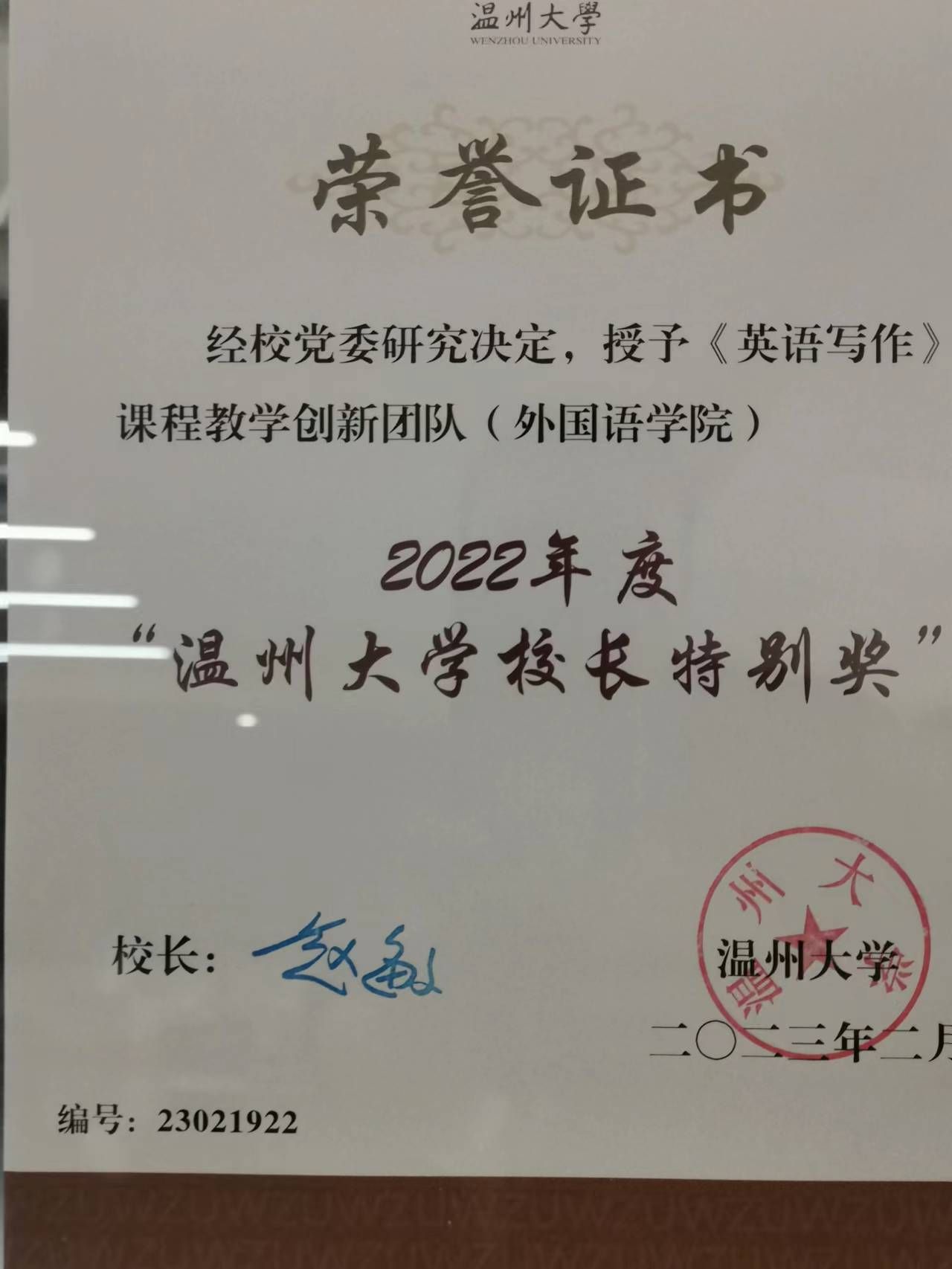 “英语写作”课程教学创新团队获评“我校校长特别奖”