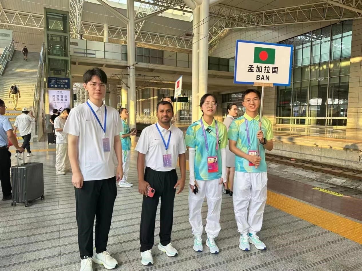 2023年9月,学院黄征黄钲老师(左一)和学生志愿者在温州南站接待孟加拉国队员