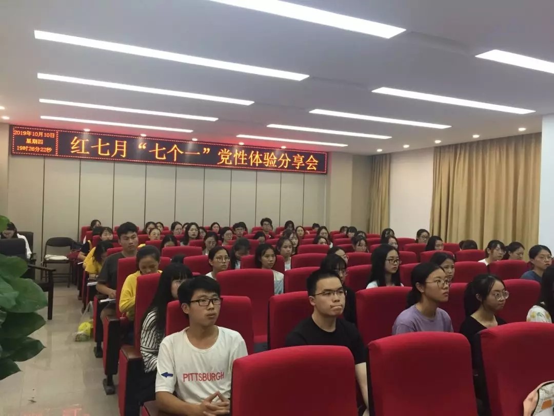 2019年10月10日晚上,太阳成集团tyc7111cc在学院报告厅举行党员红七月“七个一”党性体验分享会。学院党委副书记陈勃老师、学工办主任林秀冬老师以及辅导员单伟乐老师出席了本次会议,参加会议的还有全体积极分子与新生代表。本次会议由第一支部的郭亚莉同志主持。