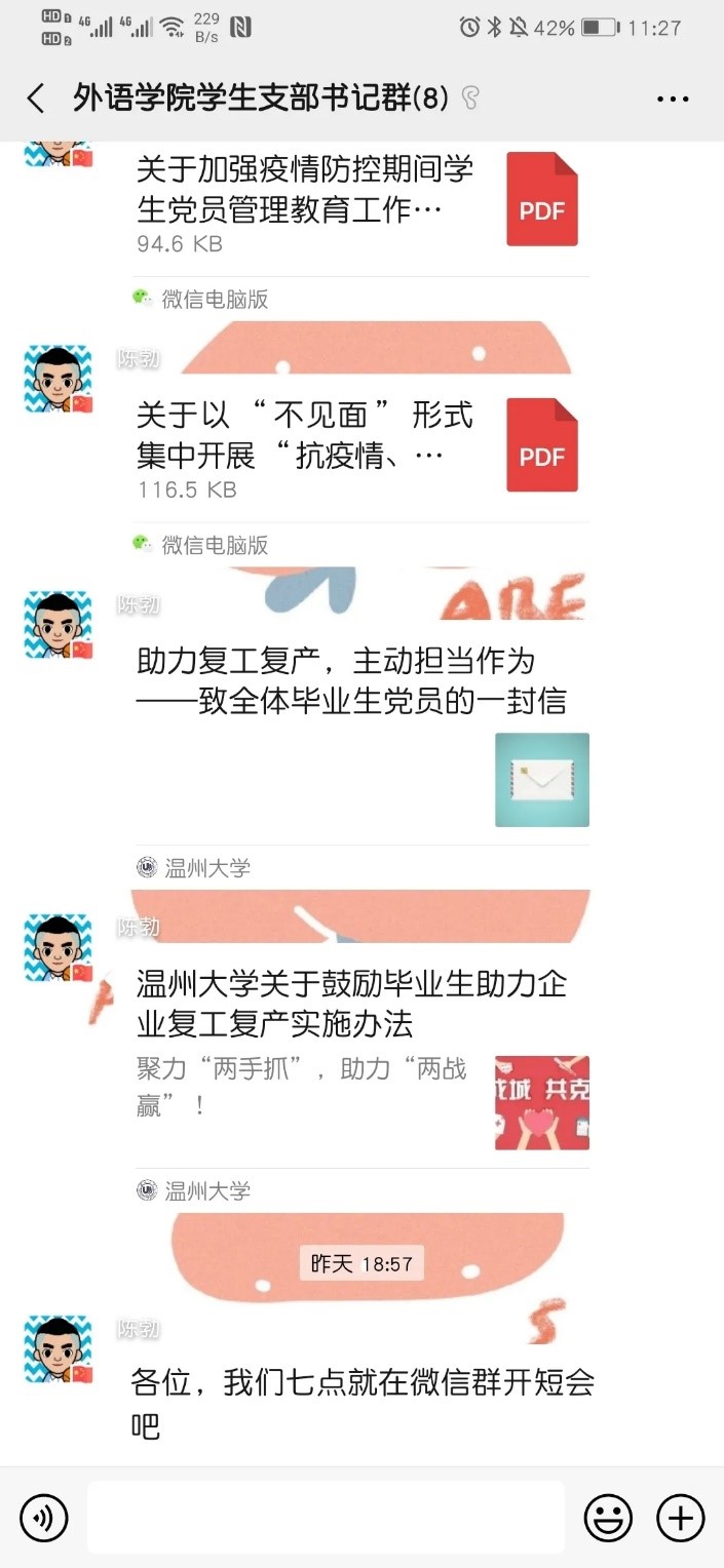 1.严肃学生党员教育管理,充分发挥党务队伍力量。有效运用学习强国等新兴媒体,加强政治理论学习,尤其是学习习近平总书记关于疫情防控工作的重要指示精神,确保“三会一课”、主题党日等各项常规工作落实到位。