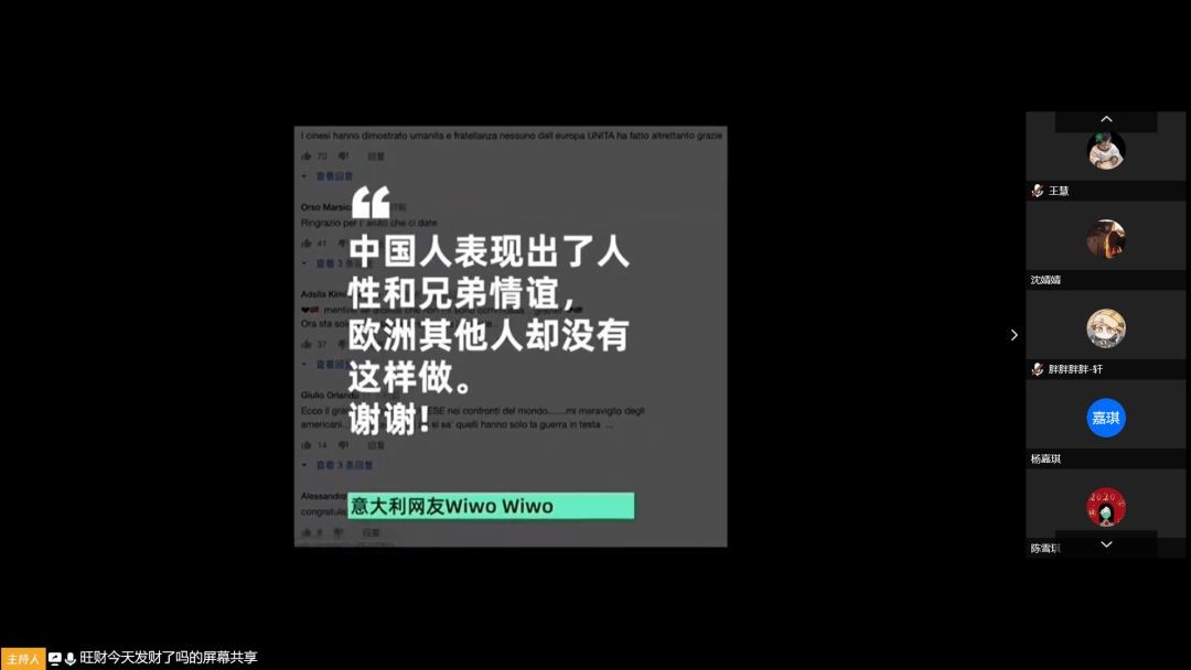 接下来,支部同学共同观看视频——中国的救援。我们可以看到 “意大利紧急求助中国”“塞尔维亚总统求助中国”的等等消息频频登上热搜。在我国的疫情防控期间,很多国家都给我国提供了帮助,“山川异域,风月同天”“岂曰无衣,与子同袍”。现在这些国家有困难了,中国贯彻“人类命运共同体”的意识理念,也对这些国家提供了力所能及的帮助。