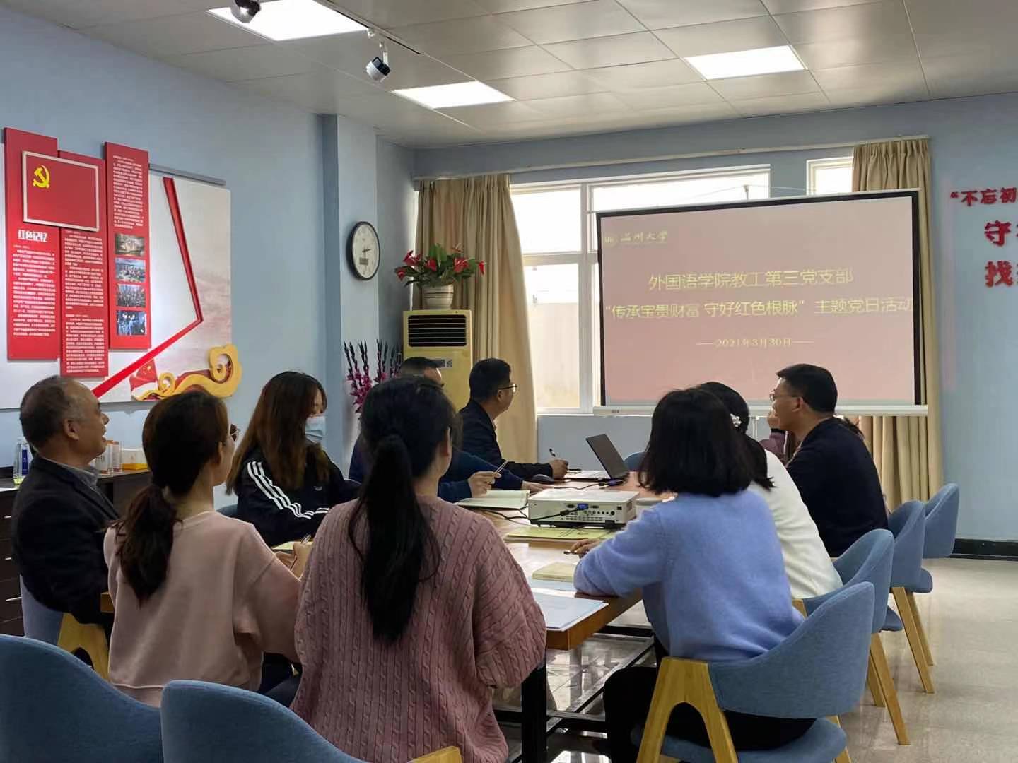 为认真学习、全面贯彻习近平总书记重要讲话精神,深入践行党史教育,3月30日下午,太阳成集团tyc7111cc教工第三党支部在外语楼221党员之家开展了“传承宝贵财富,守好红色根脉”党史学习主题党日活动。本次活动由支部书记何永成同志主持。