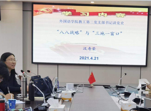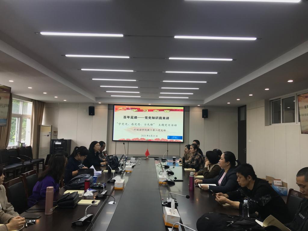 2021年,是中国共产党成立100周年,是“十四五”开局之年,也是全面建设社会主义现代化国家新征程开启之年。为了从党的百年伟大奋斗历程中汲取继续前进的智慧和力量,学院教工第二党支部于4月21日中午12:40在外语楼212会议室开展了“学党史、感党恩、当先锋”的主题党日学习活动,会议由支部书记汲寿荣老师主持,19位支部党员教师参加。