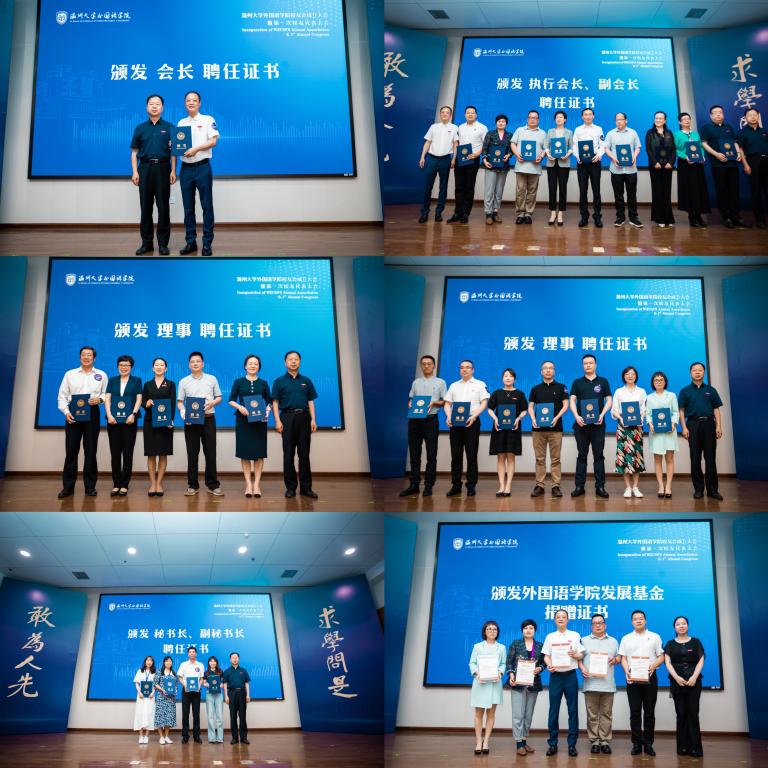 本次大会审议通过了《太阳成集团tyc7111cc校友会章程》、第一届理事会建议名单。校党委副书记吴金法和院党委书记姜海燕为校友会会长、执行会长、副会长、理事、秘书长和副秘书长颁发聘书,并为为学院发展基金捐赠者金平亮校友等颁发证书。
