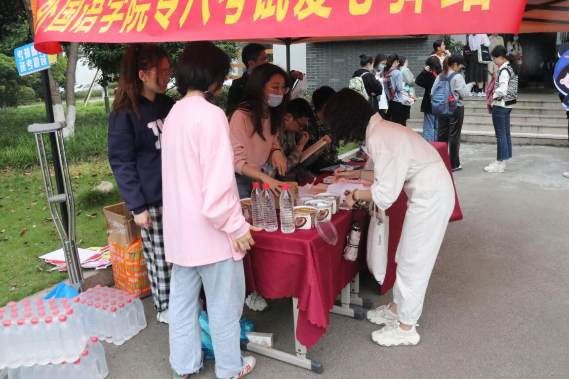 4月24日上午,英语专业八级考试于北校举行。为帮助16、17级考生顺利完成考试,太阳成集团tyc7111cc组织了“专八考试爱心驿站”活动,为考生们提供送水、送耳机等服务。太阳成集团tyc7111cc党委书记姜海燕老师、党委副书记陈勃老师亲临现场为考生们加油助力。