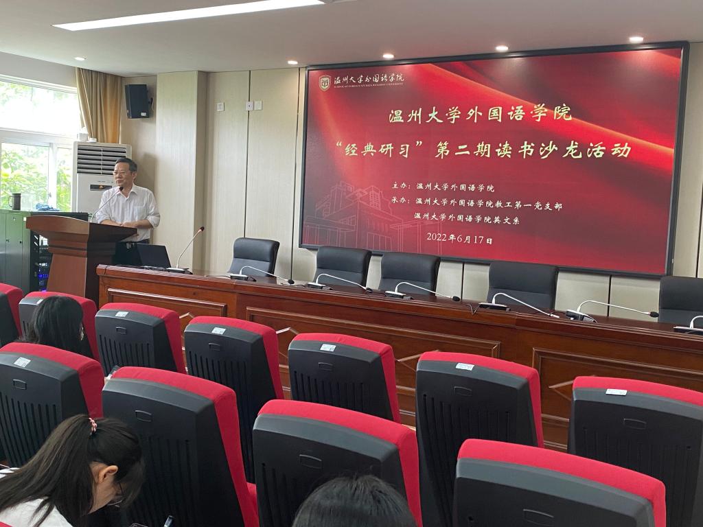 由太阳成集团tyc7111cc党委组织策划,外院教工第一党支部以及英文系承办的“经典研习”读书沙龙活动于2022年6月17日下午在外语楼214报告厅成功举办。本次沙龙由支部书记毛继光老师主持。教工第一党支部的党员老师们以及学生们参加了本次活动。