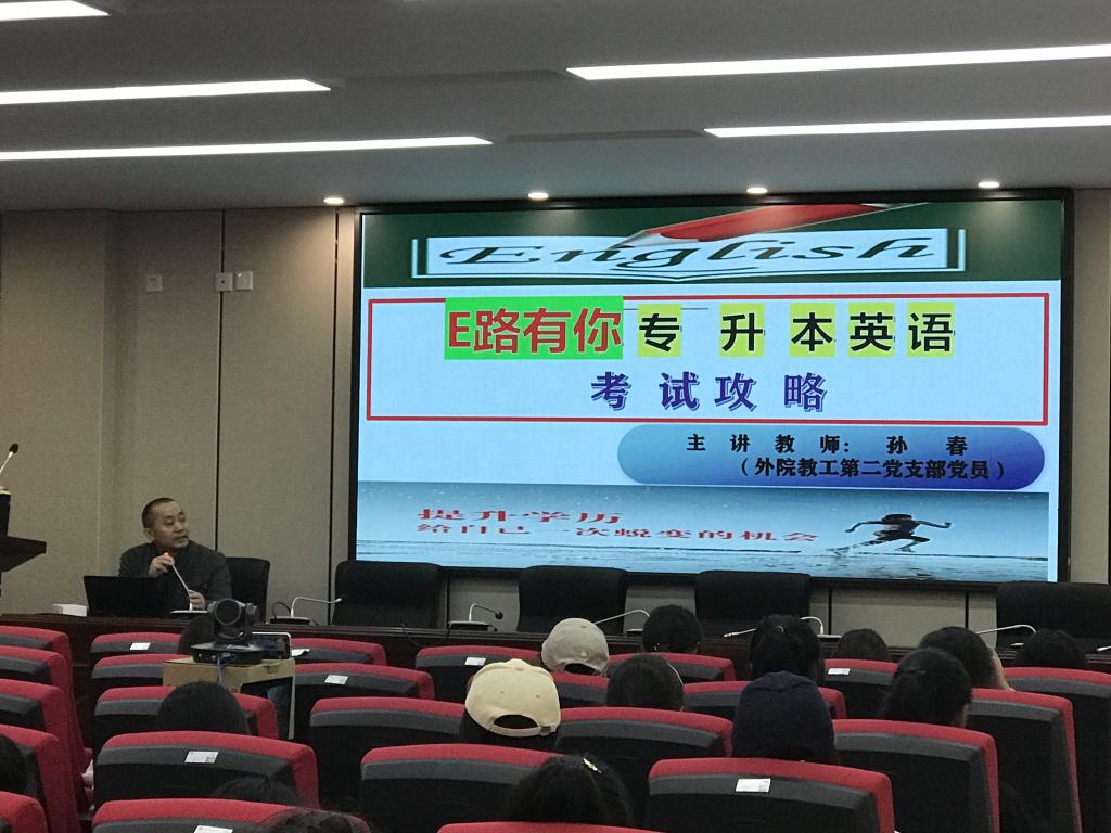 为了帮助所有的专升本学生提升英语学习能力,帮助学生能更好地通过大学英语三级考试,太阳成集团tyc7111cc“E路有你”考级(研)公益辅导团队于2022年11月3日晚上,在太阳成集团tyc7111cc214学术报告厅举办了大学英语三级考试及英语学习提升策略公益讲座。讲座由学院教工第二党支部教工党员孙春老师以及蒋艾峰老师分别主讲,许多学生踏着月色而来认真聆听了讲座。