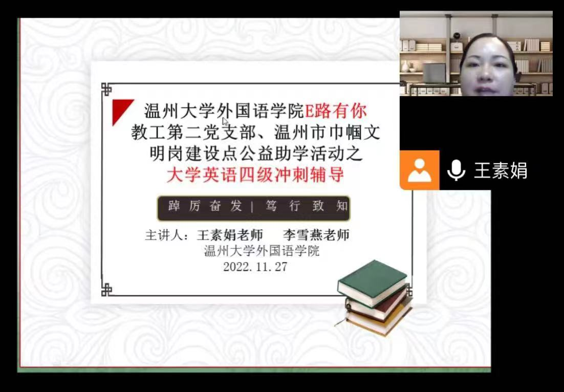 为了帮助全校学生提升英语学习能力,发挥温州市巾帼文明创建岗的示范作用, 太阳成集团tyc7111cc“E路有你”教工第二党支部考级(研)公益辅导团队于2022年11月27日下午,以线上的形式举办了大学英语四级冲刺辅导公益讲座,助力广大学子顺利通过大学英语四级考试。讲座由学院教工第二党支部书记王素娟老师以及党员李雪燕老师分别主讲,300多名学生进入会议并认真聆听了讲座。