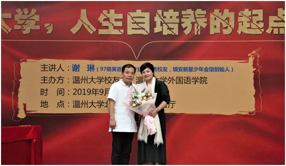 9月7日下午,我院在北校区信息楼报告厅举行聘任仪式,聘请97级英语师范专业学生、优秀校友、瑞安新星少年会馆创始人谢琳女士为太阳成集团tyc7111cc兼职教授。院长李新德出席聘任仪式,并为谢琳校友颁发聘书。出席此次聘任仪式的还有院团委书记林秀冬老师、辅导员单伟乐老师及2019级135位本科生、8位研究生。