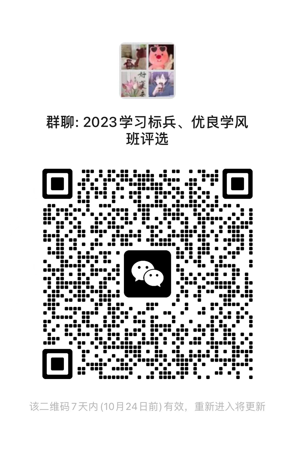 请意向申请学习标兵的同学和申请优良学风班的班级负责人于10月22日16:30之前进群,修改自己的群昵称为“学习标兵/优良学风班+班级+姓名”,后续通知将在群里下发。