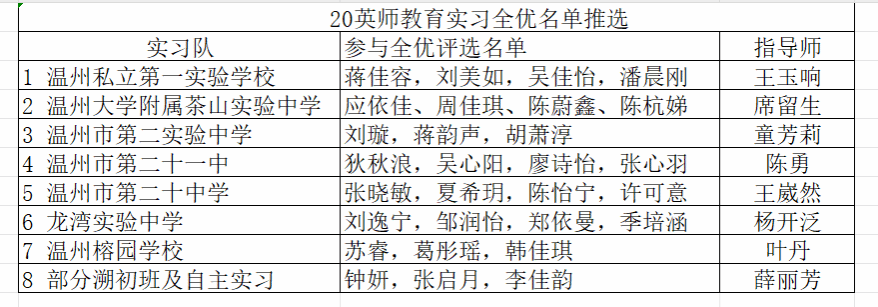20英师共有1名同学(夏依楠)参加“田家炳杯”第九届全国师范院校师范生教学技能竞赛,4名同学(王钎窈、陈含笑、陈子萱、梅雨彤)参加浙江省高等学校第十七届师范生教学技能竞赛,按教务处规定,直接认定其为实习全优,且不占学院本次全优评选名额。另按学院规定,实习总队长(郭斌)因系竞争上岗,并对实习工作做出特殊贡献,学院藉此直接认定其为全优。此外,为使20英师教育实习全优评选公开、公平、公正,现经指导老师依据学生实习综合表现推荐,学院决定按惯例举行一次教育实习全优演讲竞赛,在以下29名同学中产生21名教育实习全优生,具体安排如下。
